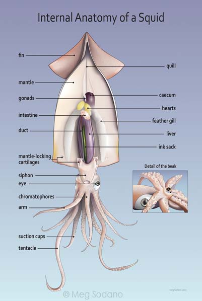 Additionally, I designed a pair of posters to illustrate the internal and external anatomy of a short-finned squid (Illex illecebrosus). The posters are each 36″ x 24″ and entirely digital, created in Adobe Illustrator. They will be used by Mystic Aquarium’s educators as visual aids for squid dissections.