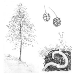 I’m starting the drawings for some illustrations of certain invasive species at Huyck Preserve in upstate NY. The art, part of an interactive book, will show the negative effects that earthworms, Oriental bittersweet (a vining plant), and hemlock woolly adelgid (an insect) have on the preserve’s forest environments. As with all scientific illustrations, this project requires a lot of research and field study. Here is a look at some of my sketches.
