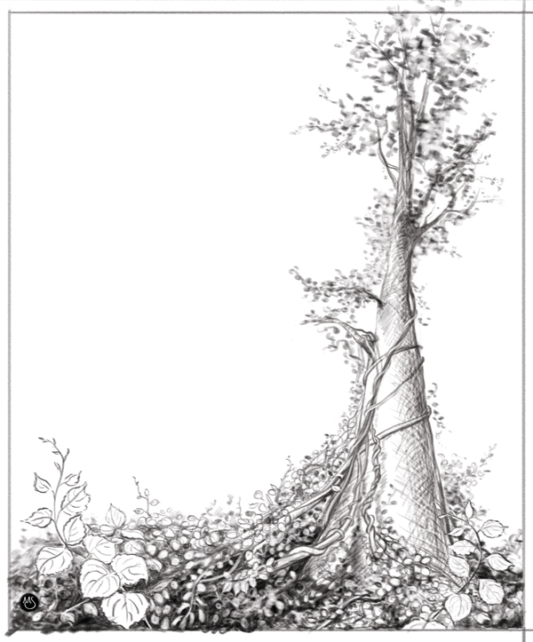 I just finished this preliminary drawing of Oriental bittersweet (Celastrus orbiculatus), part of a series of illustrations about invasive species. While wandering through the forest at Huyck Preserve early this summer, I photographed this aggressive vine and made some rough sketches to try to capture its menacing behavior. It climbs quickly, taking over everything in its path, smothering and strangling large trees until the weight of bittersweet foliage breaks their limbs and leaves them vulnerable to disease and harsh weather. I was saddened to see so much uncontrollable destruction. I also felt overwhelmed about how I was going to translate this tangled mess into a clear and attractive illustration.