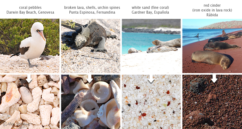 ▲ Watch where you’re walking! Seriously, sometimes the animals are right in the path – booby nests, piles of marine iguanas, newborn sea lions – and you could easily step right on them if you’re not paying attention. Another reason to look at the ground is to notice what the ground is made up of. White sands are made of coral. Black sands of shells and broken bits of lava. Observing these differences gave me a new perspective on the geology of my surroundings. The composition of beach sands can vary widely from one island to another. I visited black, red, white, golden, and even “green” sand (with tiny green crystals) beaches.