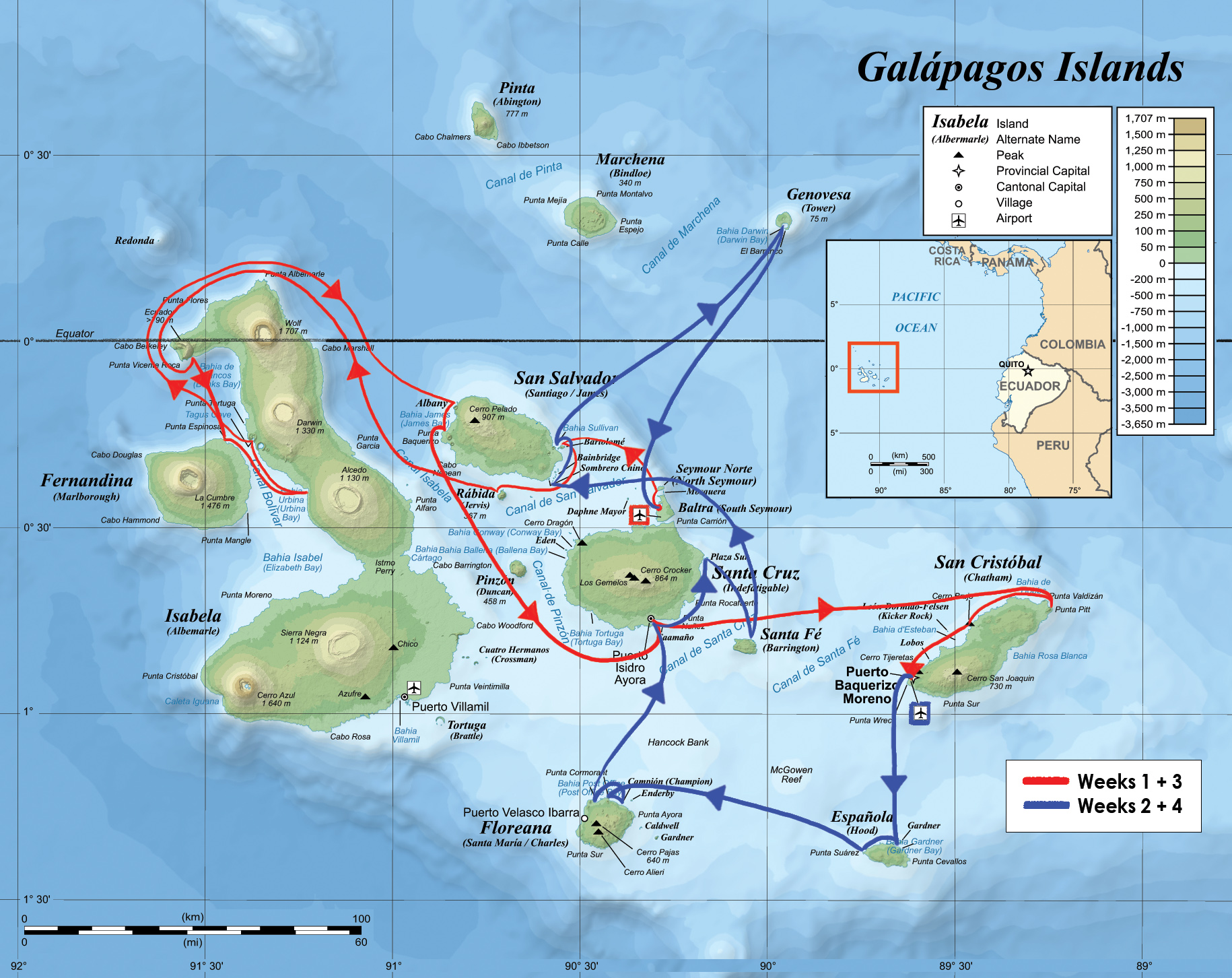 ▲ For you map-lovers out there, here are the paths of the two itineraries we took. Galápagos National Park requires that when a tour boat visits a site (beach/trail/snorkeling site) it cannot return to that exact spot until at least 2 weeks later, hence the alternating weekly itineraries. The “western” itinerary (red) begins at Baltra and ends at San Cristóbal. This trip reaches the youngest islands, including Fernandina, and allows visitors to see the flightless cormorants. The “isolated islands” itinerary (blue) starts at San Cristóbal and ends in Baltra, hopping to distant and unique places, with an opportunity to see the waved albatrosses on Española.