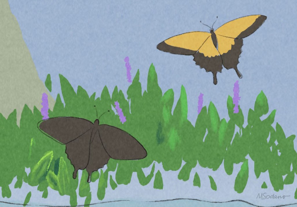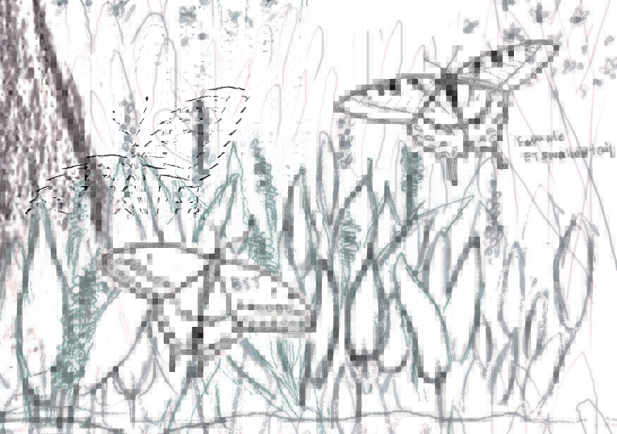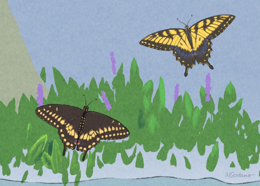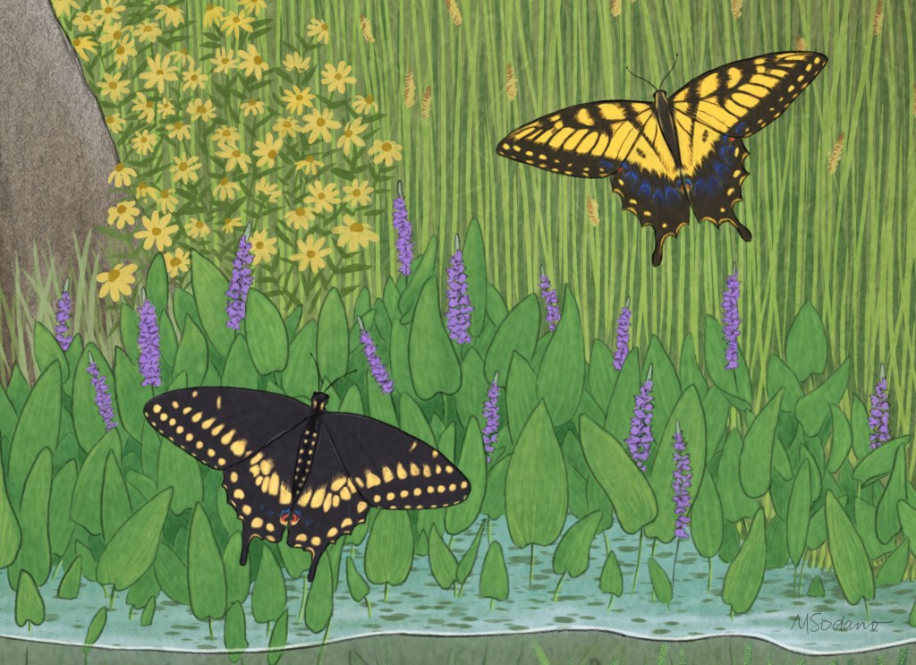 Here is an up-close view of how I added the colors of the Eastern Tiger Swallowtail and Black Swallowtail, in front of the Pickerelweed (an appropriate plant for these two butterflies).