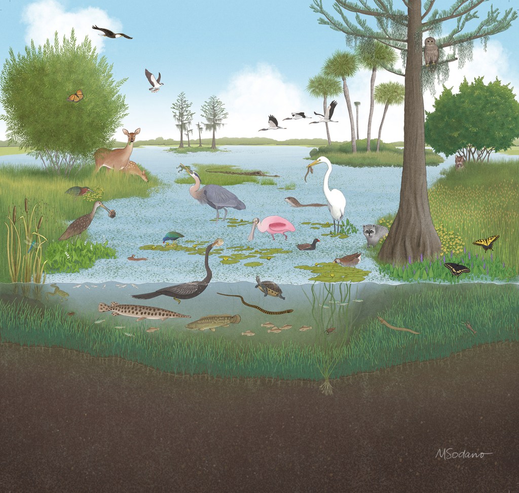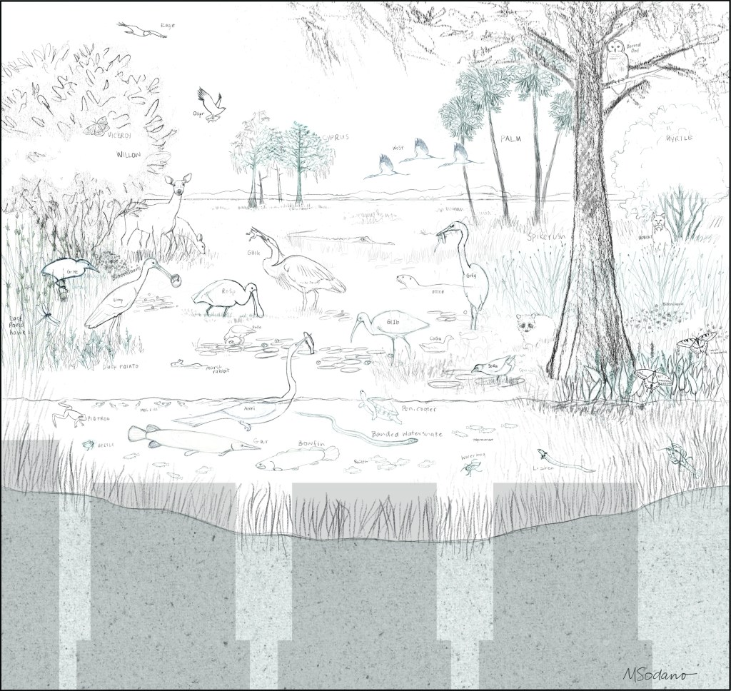 This mural functions as the background of four 3-D displays, meaning I had to illustrate around these fixtures. And I had to illustrate all the requested species, reflecting their behavior, eating their favorite foods, etc. For example: the Viceroy butterfly hangs out near willows, the Anhinga spears fish underwater, Pond Cypress are covered in Spanish moss, the Marsh Rabbit is often seen swimming. Some of these species I was familiar with. Others, like the Anhinga and the Florida Gar, were new to me. I researched them all, using field guides and videos on YouTube, and looking at photos of these species in their natural habitat. So I’ll show you two versions of my sketch.