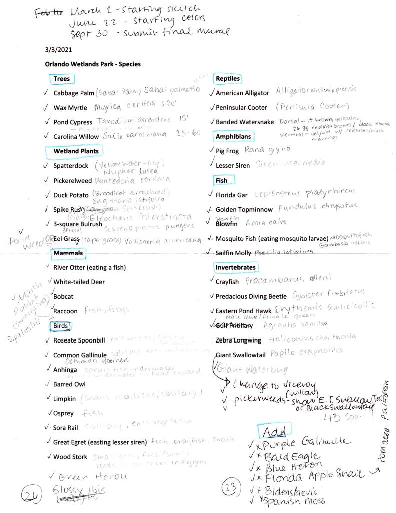 Before starting, I was given a list of 49 species to include: Trees, plants, mammals, birds, reptiles, amphibians, fish, and invertebrates.
